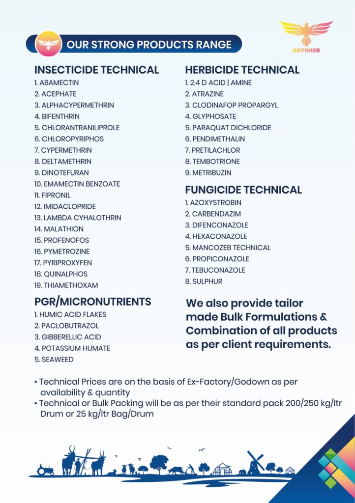 Skysher Engages in Agro Chemicals Business Such As Insecticidos, Fungicidos, Herbicide,Plant Growth Regulators & Micro Nutrients. Our Group Of Companies Are KINGSON AGROW PVT LTD & KINGSON INERNAIONAL & SKYSHER We Are Dealing in Domestic Brand Business, Import & Export, Technical B2B & Bulk Trading.